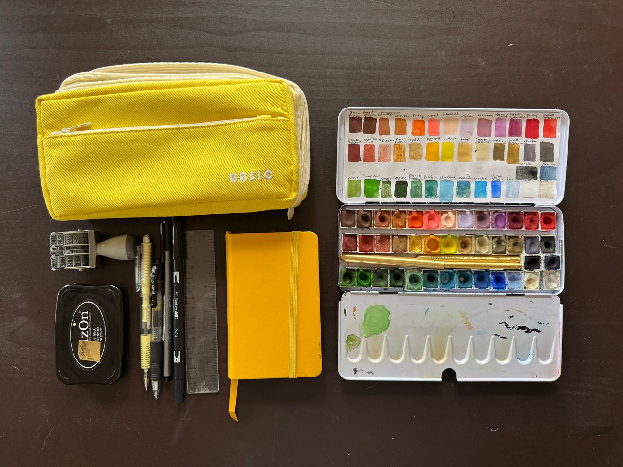 For the journal itself I am using a 3.5×5.5in Talen’s sketchbook. I love the size and the paper weight. I use Case for Making watercolors which I have collected over the past two years. I also bring three watercolor brush sizes, a pencil, a Pilot G-2 .38 pen, a brush marker, a thin marker, a date stamp, an ink pad, and a small ruler. All of these items fit perfectly into a yellow pencil case. (The exact one I have is by Angoo and hard to find now — here’s a link to a similar one on etsy and this brand looks like they are doing the same thing and sells via amazon.)