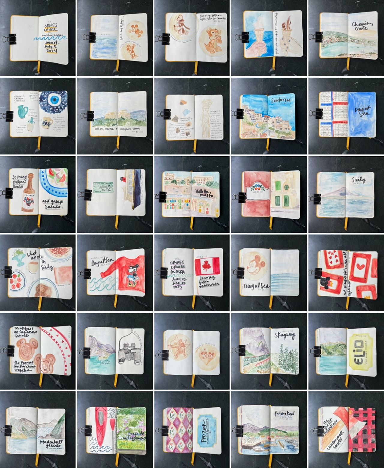 So, first up! My watercolor travel journal! I am obsessed with it. It’s a true hobby for me to work on this while we are traveling and unlike some other crafts I attempt, it’s one where the making is way more interesting to me than the having. (What I mean by that is, if I dropped my journal into the ocean at the start of trip I would be much sadder than if I dropped my journal into the ocean at the end.)