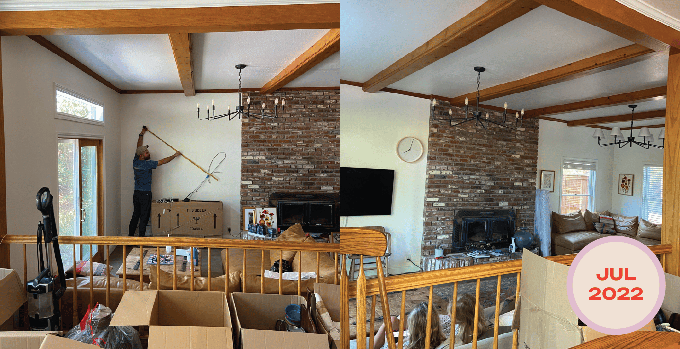 In the fall of 2022, I sold our big tan leather sectional on Facebook Marketplace and ordered a green couch and white swivel chairs to put in the same space. This photo above was a rare moment of peace in the chaos. It looks like a room! But unfortunately, to the left of the image is just a TV hanging in front of an area without furniture. We were not quite there yet.
