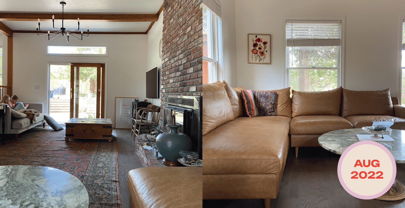 Above are a few photos from around move in time that make me feel…stressed. I shifted furniture around often as I tried to make sense of the space. We got the TV hung. I found a giant antique rug that filled the whole room. We tried our big sectional in a few spots. (As you can see, those first few months, our green marble kitchen table was still a coffee table.)