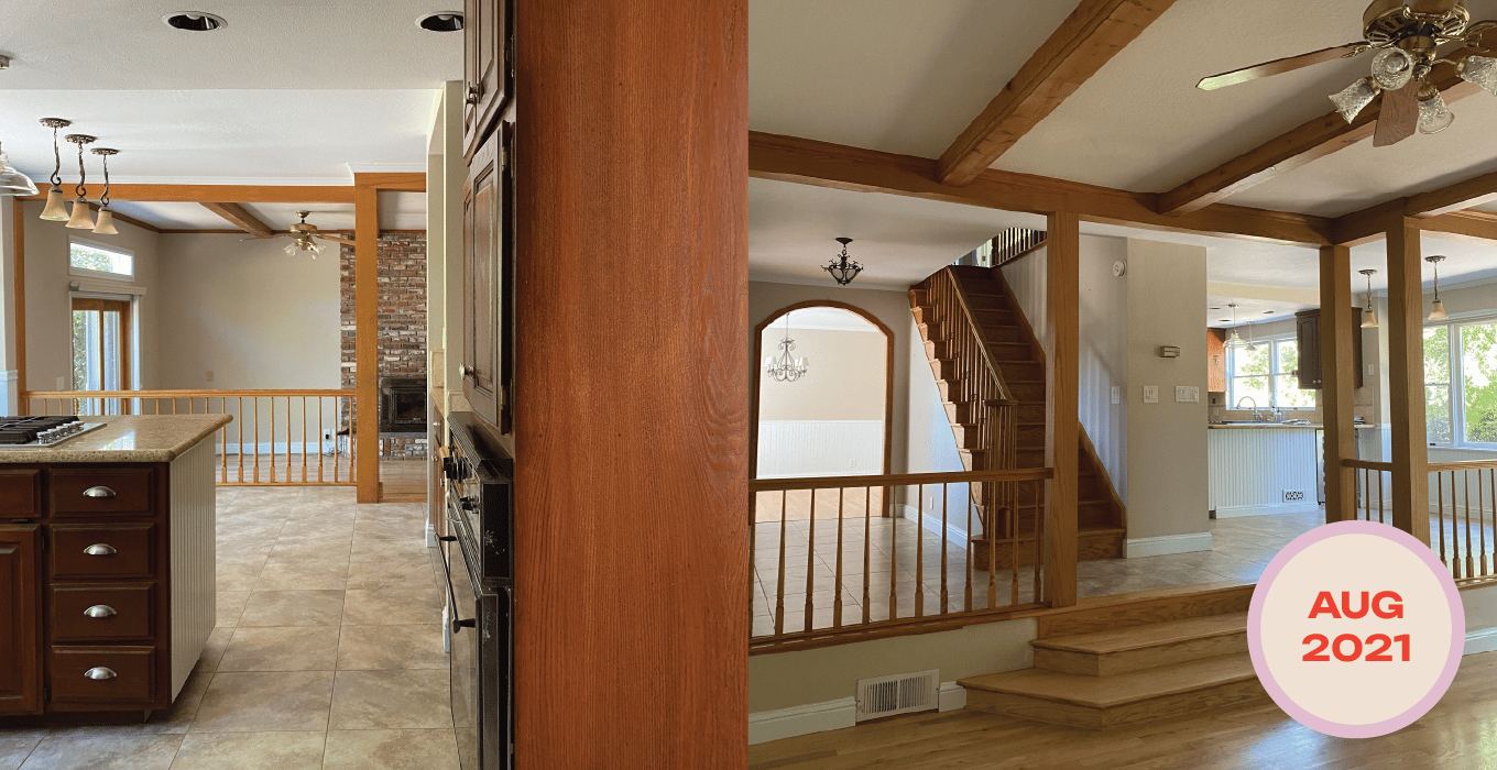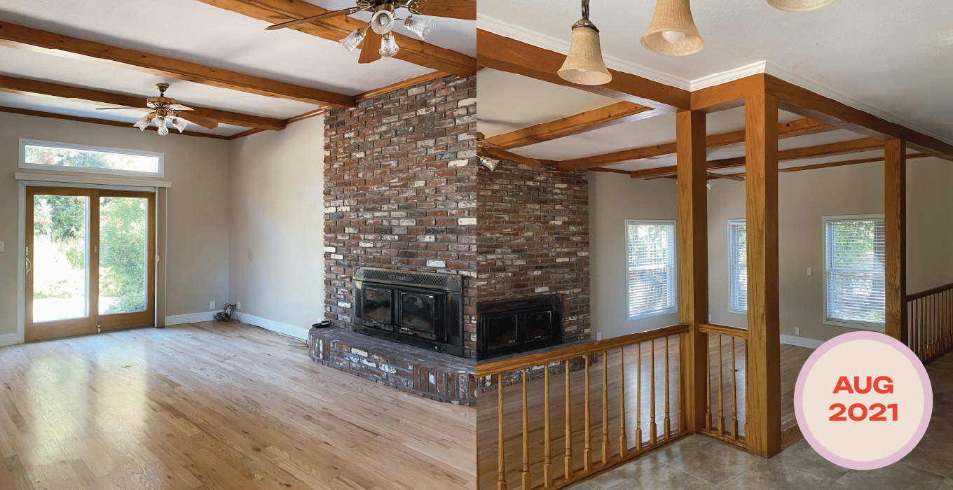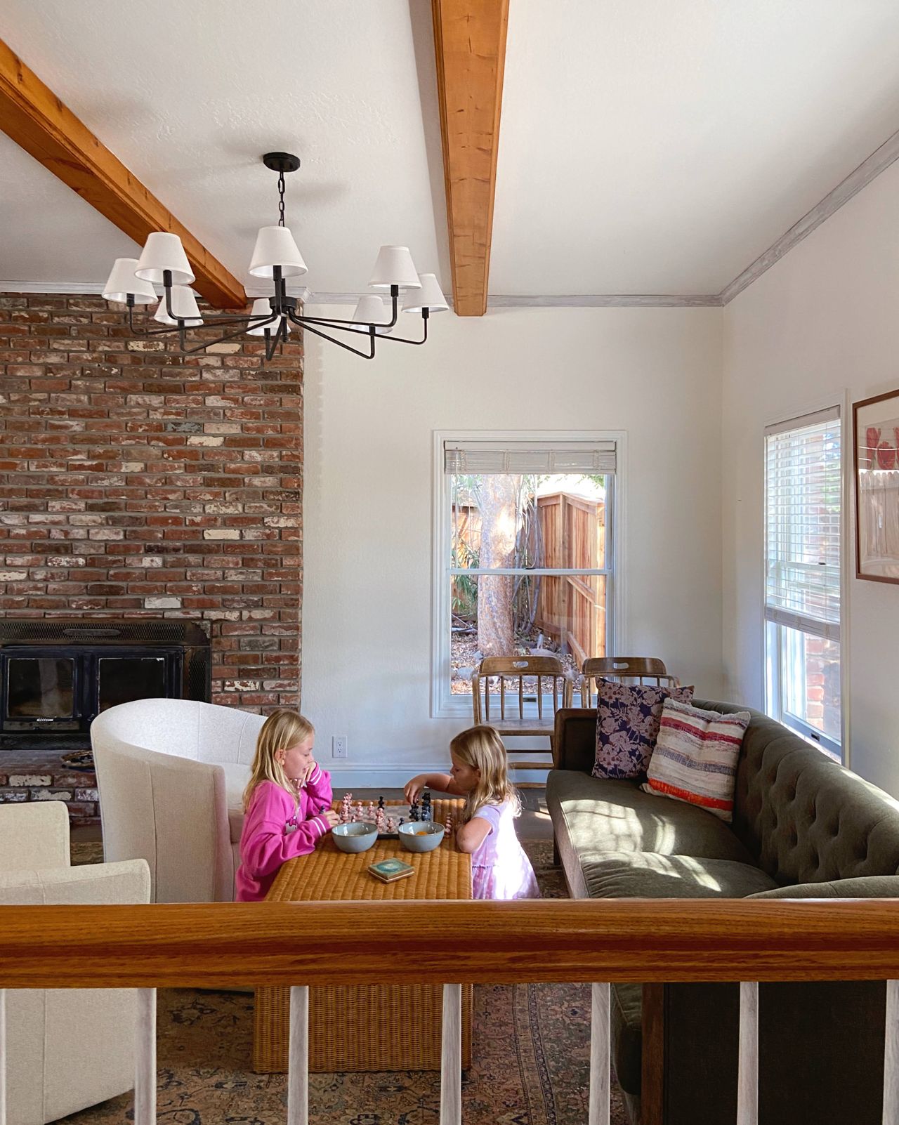 Before we moved in, in July 2022, we had the flooring stained a darker color, my dad painted the walls white (Clare Paint Whipped) and we replaced the ceiling fans with black chandeliers. After moving in, I quickly added white shades to the light bulbs.