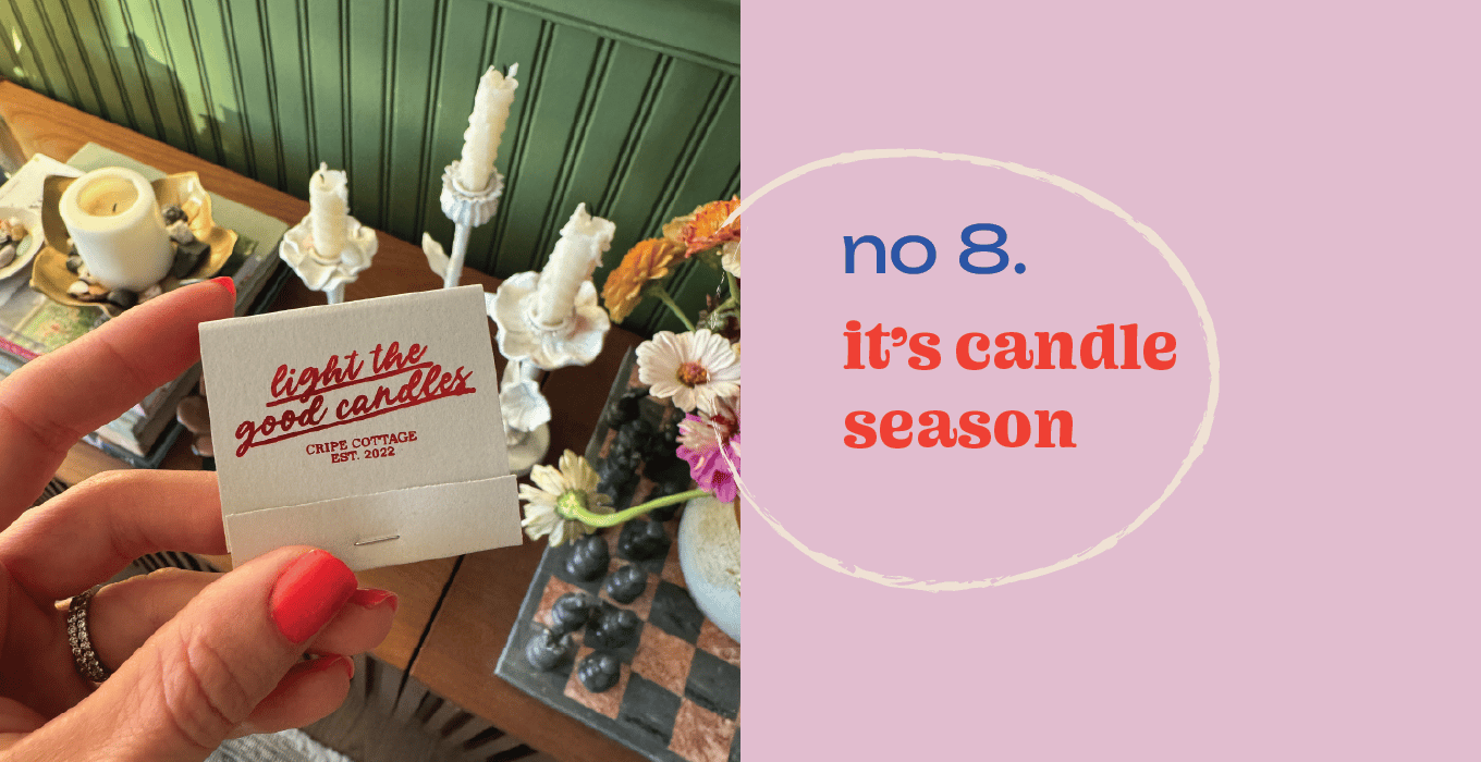 We made it to candle season. Sharing my favorite tapers (a good price!), my favorite scented candle (a splurge!), and where I get my custom matchbooks printed (too fun!).